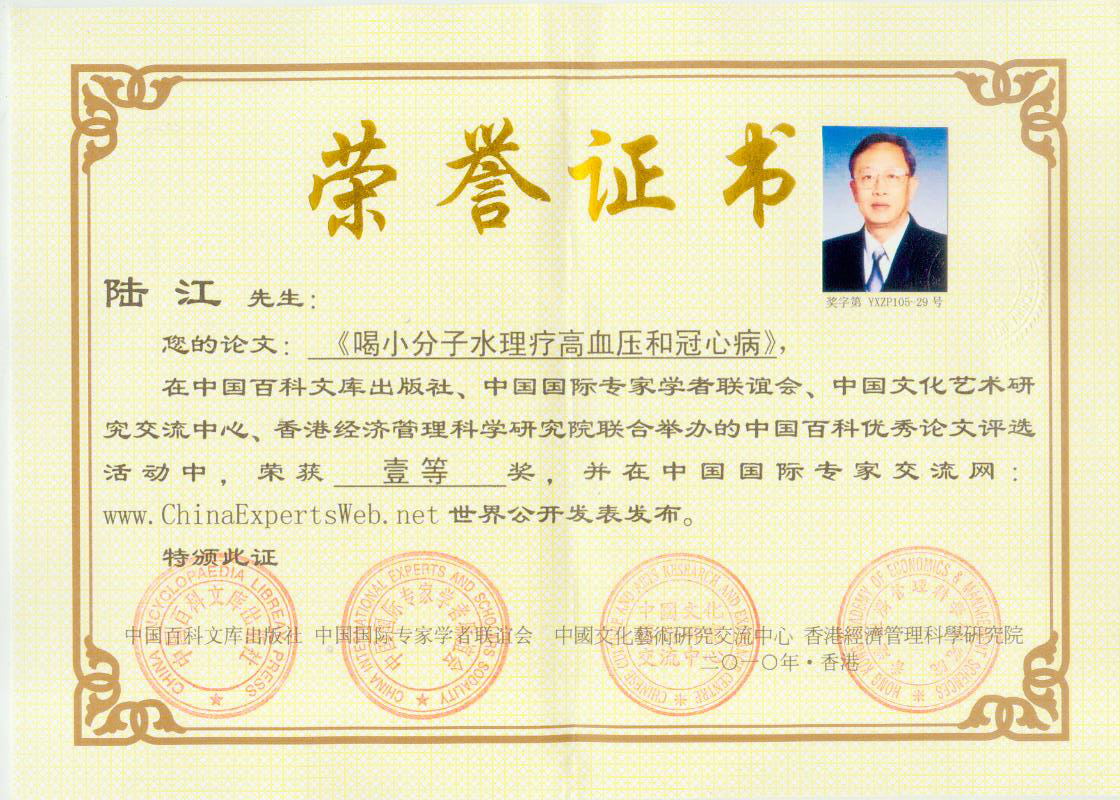 -----我是從事建筑的高工,本來沒有資格去攻克醫(yī)學(xué)難題,卻為了自身健康才扣響醫(yī)學(xué)的大門。由于我1990年患高血壓,因怕中風(fēng)才研究發(fā)明了離子水瓶,我把水處理成微小分子團(tuán)水,飲用后治愈了高血壓。便于1993年底送到三家省級(jí)醫(yī)院做臨床試用4個(gè)月。經(jīng)北京和廣西醫(yī)學(xué)專家鑒定:"降脂降壓效果好"," 能擴(kuò)大心腦動(dòng)脈流量,改善心腦電圖以及微循環(huán)","對(duì)治療心腦動(dòng)脈粥樣硬化、高血壓、高血脂有良好的醫(yī)療保健作用。""產(chǎn)品的技術(shù)性能和療效達(dá)到了同類產(chǎn)品的國內(nèi)領(lǐng)先水平,經(jīng)廣西醫(yī)學(xué)科學(xué)情報(bào)研究所檢索,未見國外有類似報(bào)道。"中國醫(yī)學(xué)科學(xué)院張正國教授從美國國立醫(yī)學(xué)圖書館數(shù)據(jù)庫存Medline檢索英俄文資料,均未見類似報(bào)告。2000年上市后,我為了對(duì)消費(fèi)者負(fù)責(zé)而繼續(xù)觀察研究,一直通過《信譽(yù)卡》和《質(zhì)量跟蹤調(diào)查書》向患者承諾療效,請(qǐng)用戶使用6個(gè)月后反饋效果。和脂壓患者飲用2至5個(gè)月內(nèi),消除癥狀,停服藥物,血壓正常;冠心病患者飲用3~5個(gè)月逐漸減輕至消除心絞痛、房顫等癥狀,不再服藥,飲用1年左右心電圖正常,經(jīng)冠脈造影掃描無明顯狹窄,表明冠心病痊愈。大量患者還反映許多衰弱器官被修復(fù),讓前列腺增生、慢性咽喉炎、慢性氣管炎、支氣管炎、慢性胃炎、腸炎和膽囊炎等不藥而愈;2型糖尿病患者是因?yàn)橐葝u衰弱致病,飲用該水半年至一年,逐漸減藥至停藥,血糖尿糖正常,真正治愈2型糖尿病。中風(fēng)后遺癥患者飲用六七個(gè)月,可逐漸減輕至消除肢體和語言障礙,表明飲用該水能讓壽命很長(zhǎng)的神經(jīng)元細(xì)胞逐漸修復(fù),奇跡般地恢復(fù)肢體和語言功能。飲用后還使胸腺和脾臟兩個(gè)重要的免疫器官被修復(fù)和增強(qiáng),產(chǎn)生免疫細(xì)胞多,提高了免疫力,使人不生病或少生病。自此, 飲用微小分子團(tuán)水創(chuàng)造了攻克冠心病、高(低)血壓和糖尿病三大醫(yī)學(xué)難題的奇跡。人們對(duì)此感到不可思議,但實(shí)踐是檢驗(yàn)真理的唯一標(biāo)準(zhǔn)。